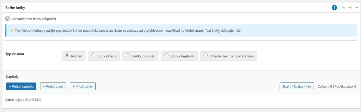 Pak můžete přidávat kapitoly (nebo jiné části knihy, podle toho jaký typ obsahu jste vybrali). V tomto návodu budeme pro zjednodušení hovořit jen o kapitolách.