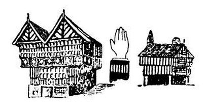 Ještě jednou se však musíme zastavit; musíme se jenom podívat, kde tu vlastně je ta veselá stará Anglie. Stará Anglie, to je, dejme tomu, Stratford, to je Chester, Exeter a já nevím co ještě. Stratford, Stratford, počkejme, byl jsem tam? Ne, nebyl; i neviděl jsem rodný domek Shakespearův, nehledíme-li k tomu, že je od gruntu přestavěn a mimoto že snad žádný Shakespeare vůbec neexistoval. Ale zato jsem byl v Salisbury, kde působil zcela nepochybný Massinger, a v londýnském Templu, kde se zdržoval zaručený Dickens, a v Grasmere, kde žil historicky doložený Wordsworth, a v mnoha jiných dokumentárně nesporných rodištích a působištích. Dobrá, našel jsem porůznu onu dobrou starou Anglii, která po zevní stránce pozůstává z černého trámoví a vyřezávání, následkem čehož je pěkně černobíle pruhovaná. Nerad bych dělal příliš odvážné hypotézy; ale zdá se mi, že černobílé proužky na rukávech anglických strážníků mají svůj původ právě v tom pruhovaném slohu staroanglických domů, jak ukazuje náš obrázek.