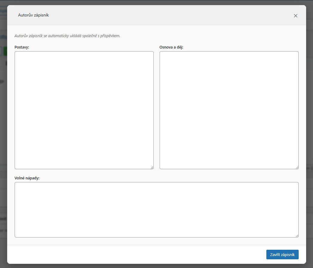 Po kliknutí na modré tlačítko “Autorův zápisník” se otevře okno, rozdělené na položky “Postavy”, “Osnova a děj” a “Volné nápady”.