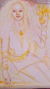 když jsem zaspala,taky se mi ve snu zdálo,že spím u svíčky. Z plamínku se začalo divně kouřit a z kouře se tu objevil někdo, jako anděl s ohně moc krásný, ale taky strašidelný, řekl,co mu dám, když to tu nespálí? Nevím, co by chtěl? A on mě chytl za ruku a stáhl do kouře, do plamene a uhasil to, co by jinak shořelo, kouřem mě vedl a letěl se mnou do jinýho světa, tam se mnou prošel železným mostem,pod mostem byla láva a kolem velký oheň, skály a ve skále průchod, brána zapomnění, dál byl jiný svět a slavnost ohňů, barevných a kolem nich tančili čerti a jiní divňouši, přistoupil se mnou k hodovnímu stolu a dál mě hnusný pálivý pití a nutil, ať se napiju,pak někam zmizel a já jsem se tam bála,přistoupila ke mě jakási seschla babka, řekla,že tam nemám co dělat a kdo mě tam přivedl?Někdo řekl, že jsem ta co uhořela! Řekla jsem, že jsem neuhořela a pozval mě k nim anděl s ohně, pak se ke mě nahrnuli různí divňouši, řekli že musím ke králi a táhli mě kamsi do černé věže, vedli tam barevný schody a dál červený pálivý koberec na který nesměl nikdo stoupnout a oni mě na ten koberec shodili a já si spálila ruce a kolena, koberec vedl k obřímu trůnu a na něm seděl strašidelný obr v černým plášti a bouřkovým hlasem zařval:,,Co tu zase všichni chcete!¨Řekli, že jsem přerušila slavnost a co se mnou? Mávl na ně rukou ať se odejdou bavit dál a nechají mě tam, tak odešli, on vstal a šel ke mě, řekl, že se k němu neumím chovat, jako ke králi, ale že mě to odpouští a ptal se, jestli se ho bojím? Kývla jsem a řekla, že se ho bojím a omlouvám se, ale nevím, jak se mám chovat ke králi, ještě nikdy jsem se z žádným králem nesetkala, přitom mi nešlo se mu nedívat do jeho č